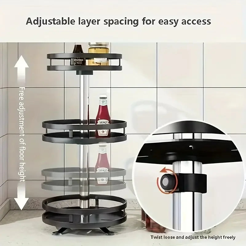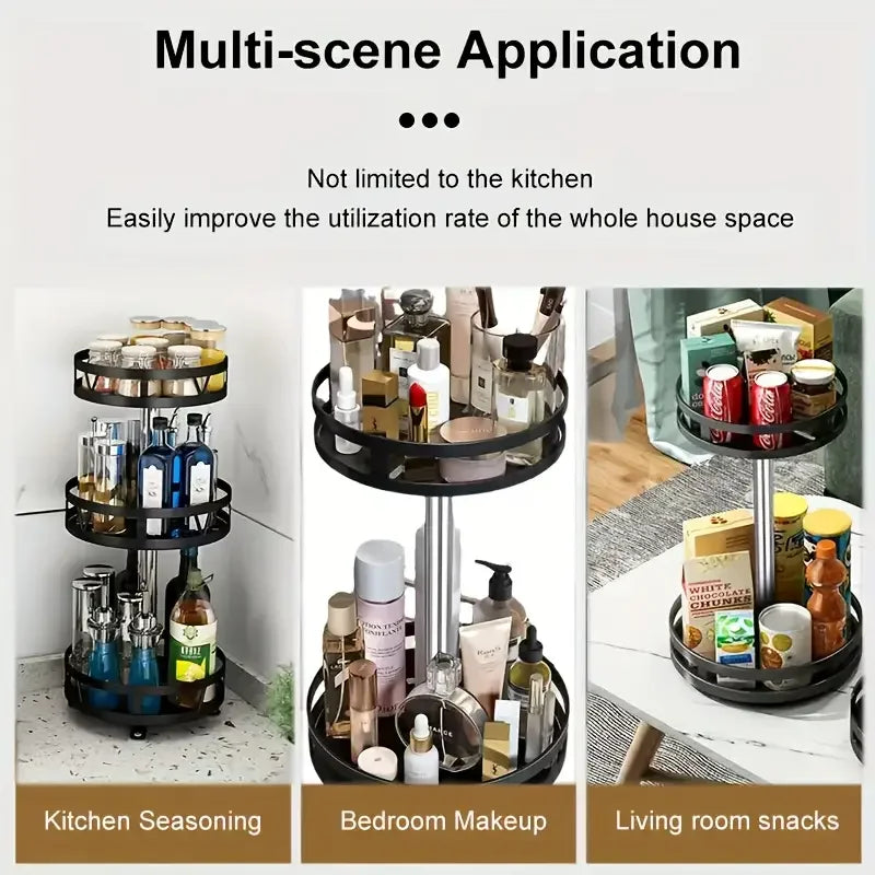 This 3-tier rotating metal rack offers 360° access, sturdy storage, and a sleek design perfect for organizing spices, food, or cosmetics in any room.