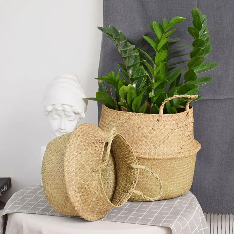 Seagrass Rattan Basket Foldable Wicker Organizer Handmade Plant Pot Laundry Bin Decorative Boho Style for Garden Home Decor