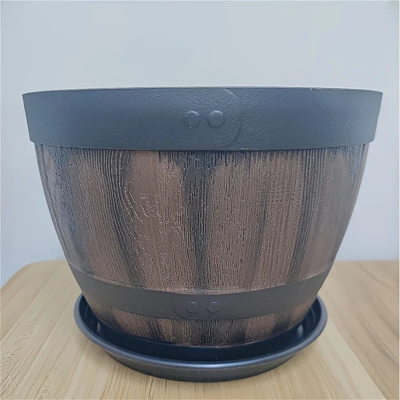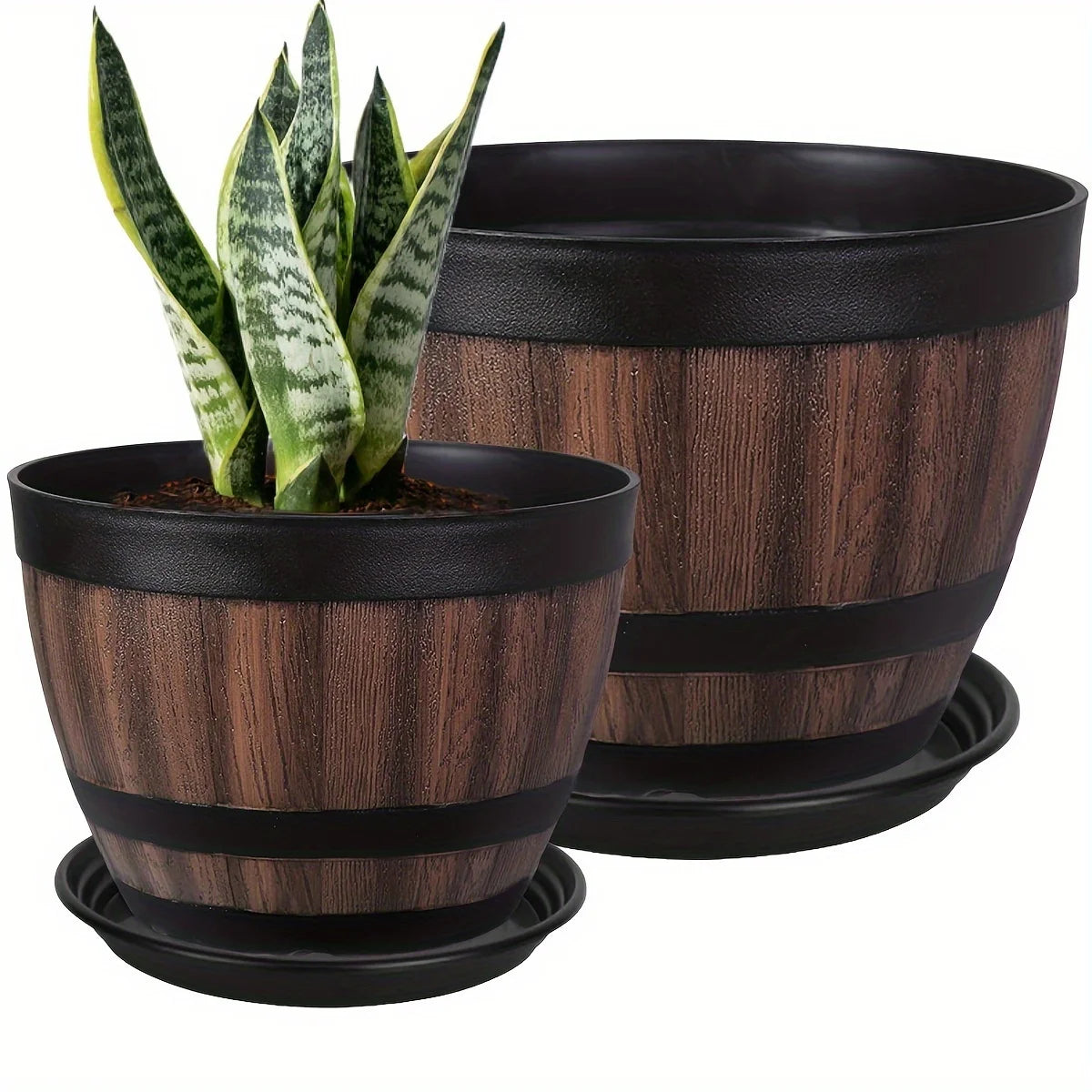 Set of 2 vintage whisky barrel planters, garden flower pots with drainage holes, plastic oval plant containers